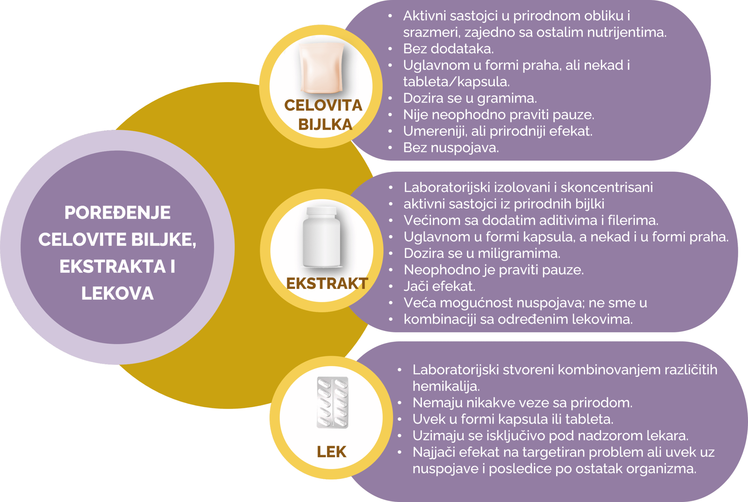 - Kvalitetna, celovita biljka često ima više zdravstvenih koristi, jer sadrži sve prirodne nutrijente u izbalansiranom obliku — deluje blaže, ali dugoročno dovoljno snažno, bez rizika i najčešće bez potrebe za pravljenjem pauza.
