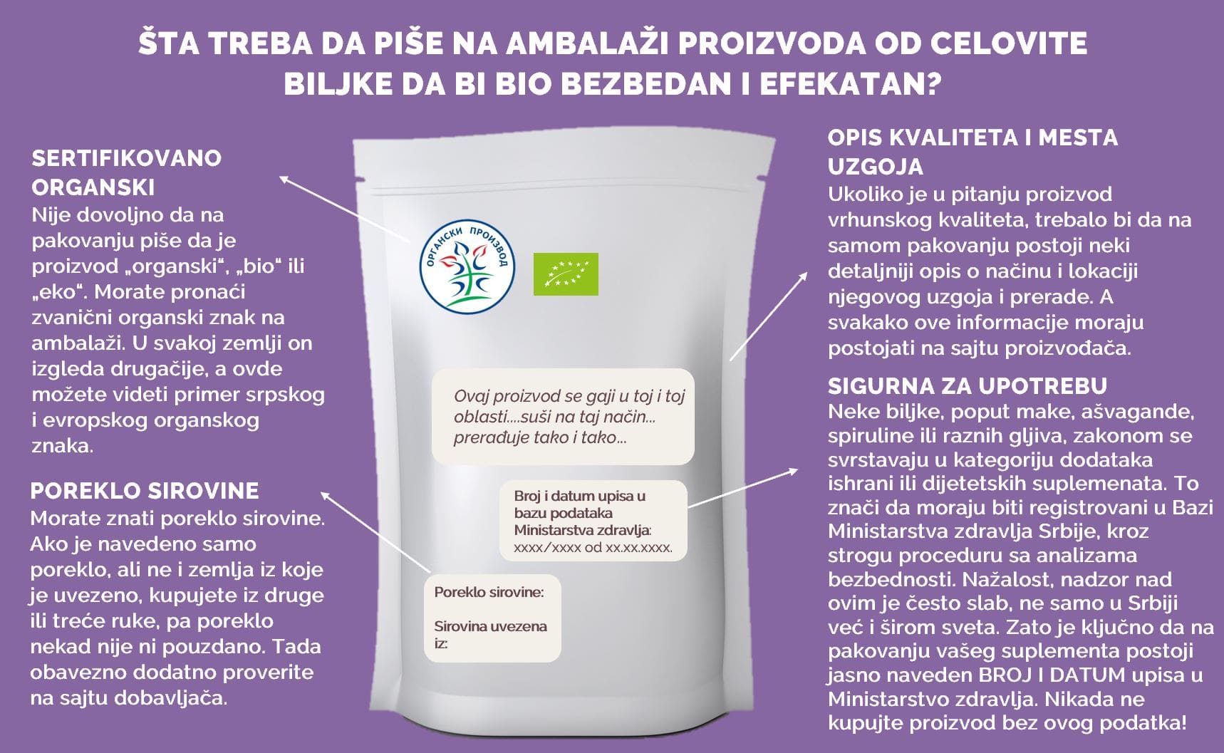 Ukoliko je u pitanju biljka, odnosno proizvod koji je kategorisan kao dodatak ishrani (suplement), na pakovanju mora biti naveden broj upisa u bazu Ministarstva zdravlja. Obavezno potražite taj broj.