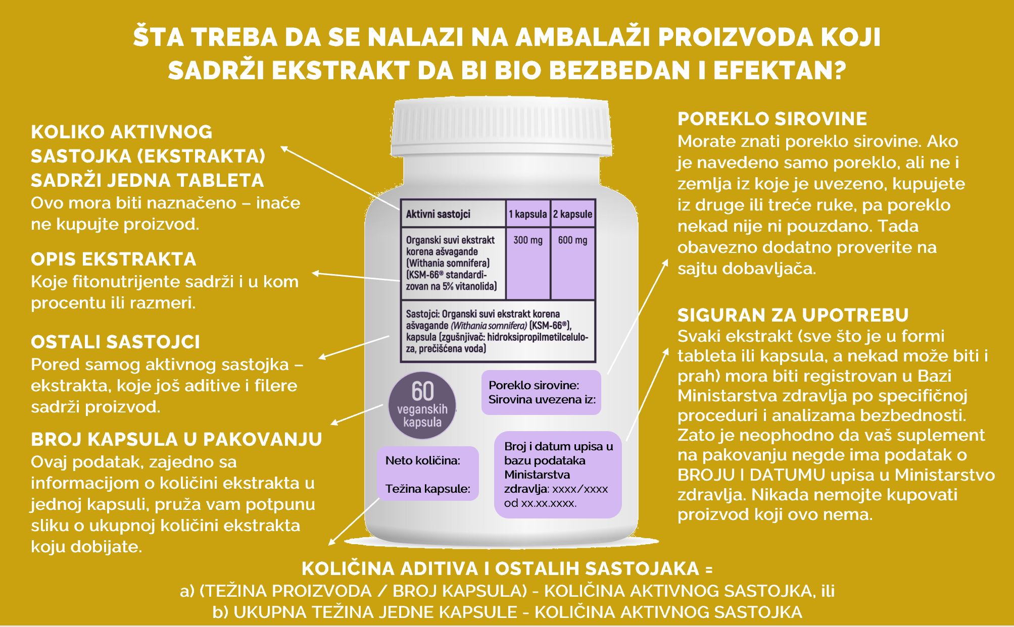 - KOLIČINA ADITIVA I OSTALIH SASTOJAKA = (TEŽINA PROIZVODA / BROJ KAPSULA) – KOLIČINA AKTIVNOG SASTOJKA, ili