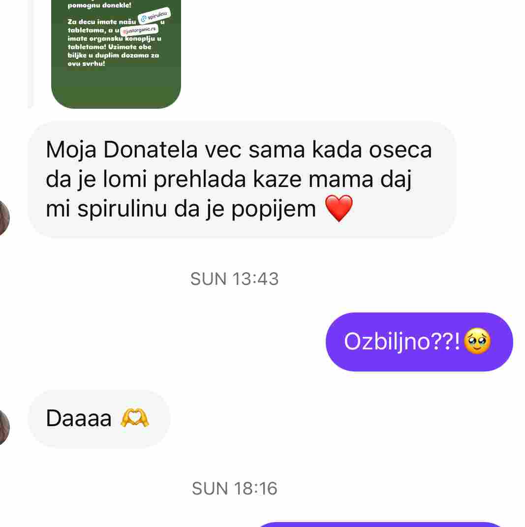 Spirulina iskustva prikazana na slikama ispod su preuzeta iz javnih komentara i poruka; rezultat je individualan. Iskustva korisnika sa našom spirulinom u prahu često se odnose na više energije, bolji imunitet, gvožđe, kao i komentare da joj je ukus mnogo lepši od drugih na tržištu. Vaše redovne poruke i komentari su već godinama najlepši deo čitavog našeg poslovanja. Just Superior nema plaćene reklame ovog tipa, ni sponzorisane objave – kad ima, jasno je naznačeno.